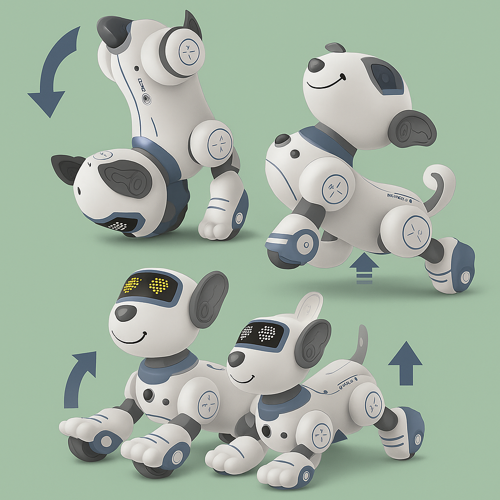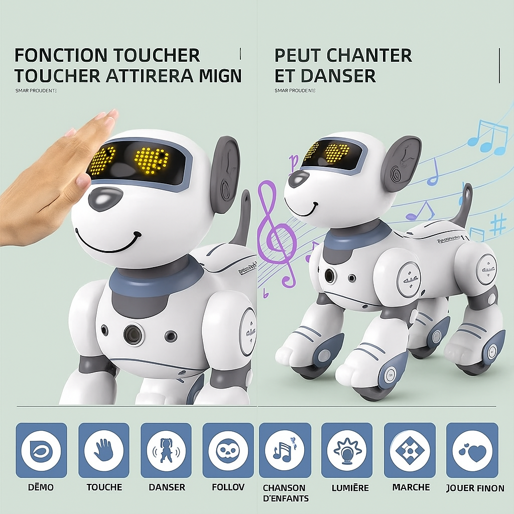 - Télécommande intuitive : permet de contrôler le chien à distance, de lui faire marcher, danser ou exécuter des actions.