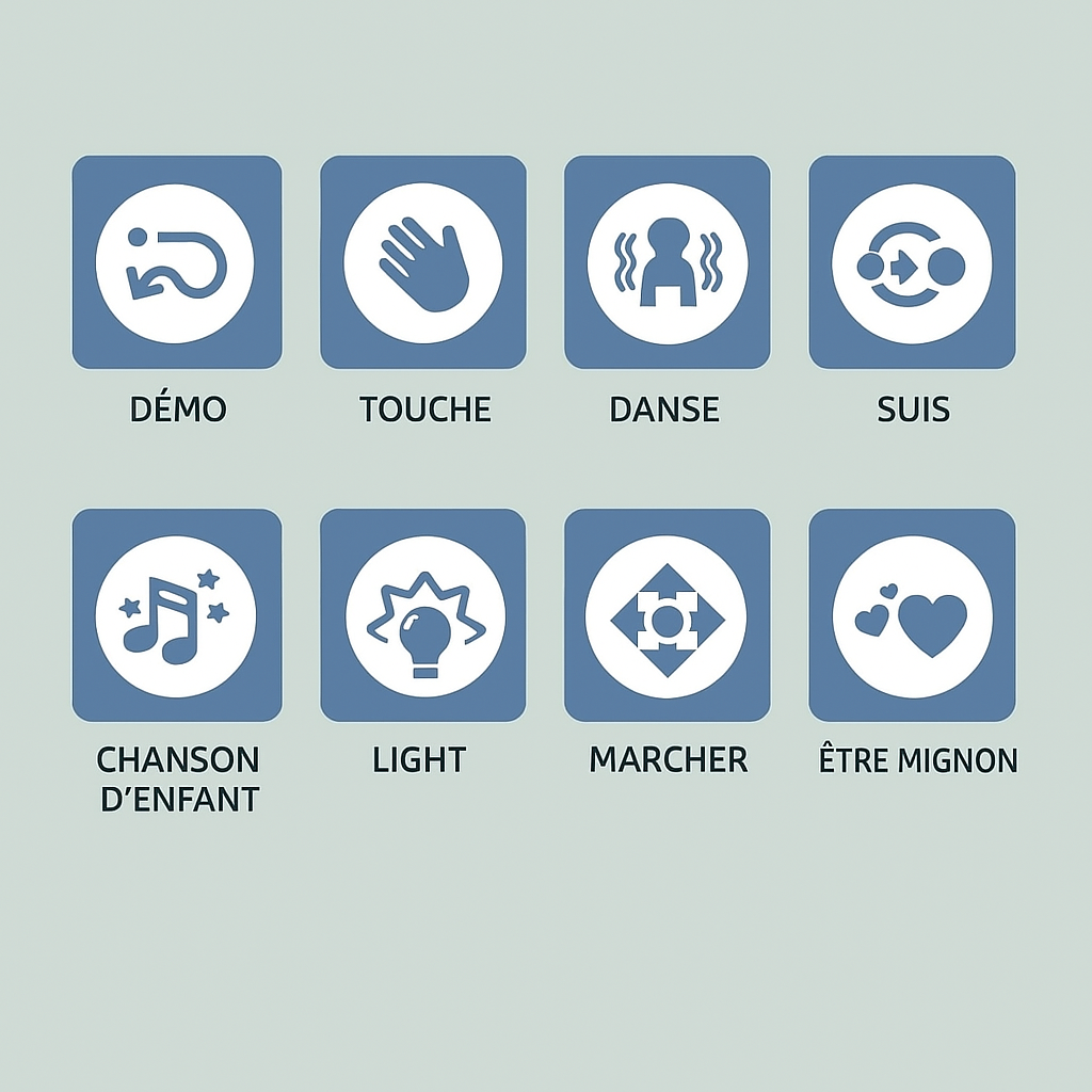- Réactions réalistes : le robot réagit à la voix, aux gestes ou au toucher selon les modes, rendant l’expérience vivante.