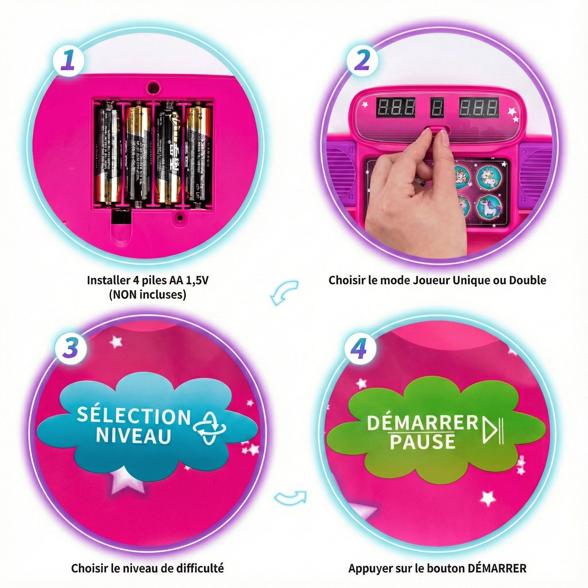 - Zéro Câble. Pas de TV, pas d'HDMI, pas de wifi. Insérez 3 piles AA et le jeu démarre en 30 secondes.